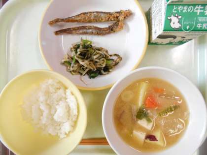 今日の献立は、ご飯、ししゃもの唐揚げ、いそ和え、さつま汁、牛乳 です。
