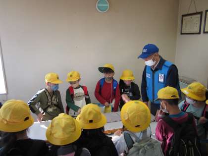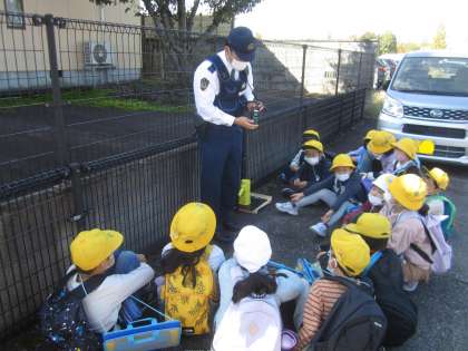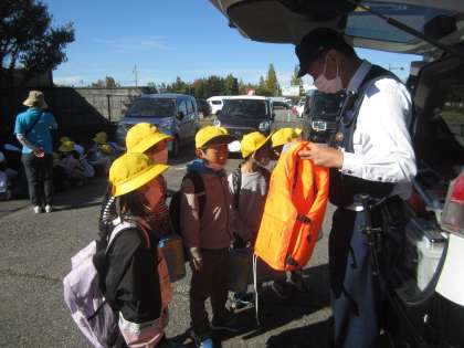 最初は、空港前交番です。毎日、登下校の時間帯に交番の前で見守ってくだる方がいることは知っていましたが、実際、交番は何をする場所かまでは知らない子供がほとんどです。今回は、交番の中にも入れていただきました。また、警察官の装備品も見せていただきました。こんなに間近でみることはなかなかできません。
