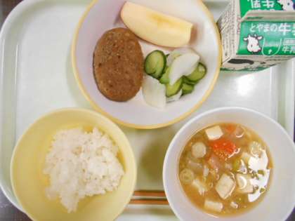 今日の献立は、ご飯、和風煮込みハンバーグ、きざみ和え、豆腐のみそ汁、りんご、牛乳 です。