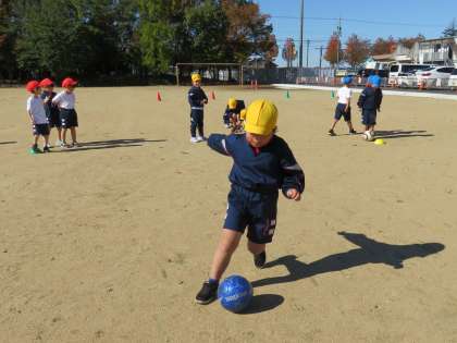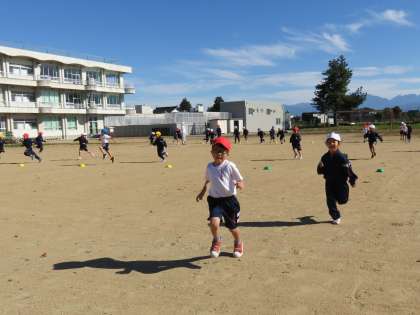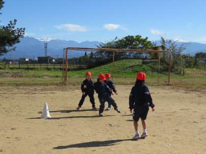 秋晴れの空の下、グラウンドで体育を行い、思いっきり走ったりボールけりをしたりしました。今日は立冬。遠くの山は、雪が積もっていました。体を動かして、汗びっしょりになりました。