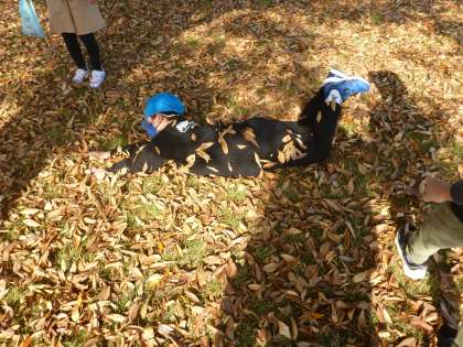 ・落ち葉の上を転がり、感触を楽しみました。周りの子供たちも遊びに引き込まれていました。(画像左)