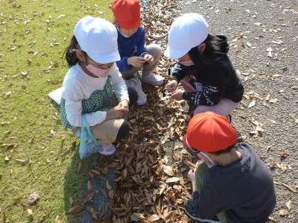大きなどんぐりを夢中になって拾ったり、落ち葉を使った遊びを考えて楽しんだりしました。また、広い芝生で、交流級の友達とドッジボールや鬼ごっこ、ハンカチ落とし等をしました。集団遊びの楽しさを感じたひとときでした。
