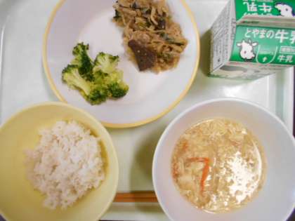 今日の献立は、麦ごはんのスタミナレバー丼、ゆでブロッコリー、中華かき玉スープ、牛乳 です。