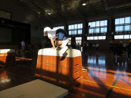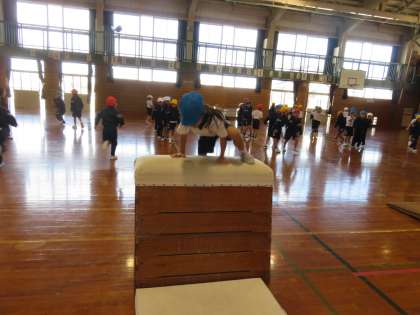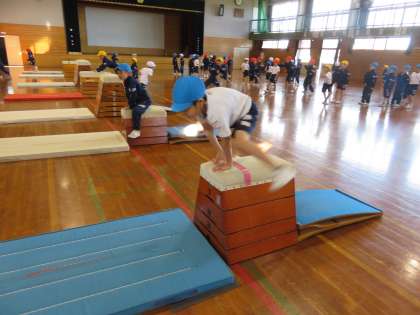 ジャンプ、山登り、馬乗り、横跳び、跳び箱(開脚跳び)の5コース、7台の場があり、子供たちは、自分の跳びたいコース、できるようになりたい技を選んで練習します。踏切の仕方、手の付き方、着地の仕方等、跳び箱運動につながる運動の場が工夫されています。今日は、練習の成果をみんなの前で発表しました。