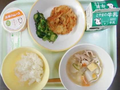 今日の献立は「学校給食とやまの日」の特別献立です。ご飯、白えびのかき揚げ、昆布和え、とやま豚汁、富富富のお米ムース、牛乳 です。