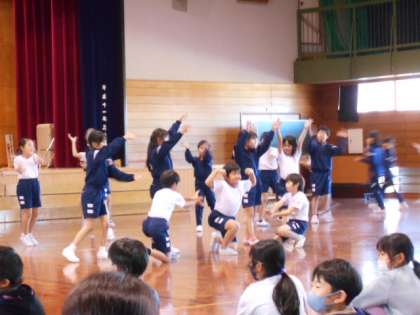 今日は、新保っ子タイムに「得意なこと発表会」がありました。8組の出場者から、なわとび、ダンス、大縄、合奏等が披露されました。声援や手拍子で盛り上がりました。(写真は3-1のダンスです)