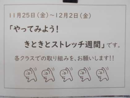 学校保健委員会で「正しい姿勢」について学びました。今週(〜12月2日)は、「やってみよう!きときとストレッチ週間」です。ちょうど「家庭学習がんばり週間」でもあるので、家で読書や勉強しているとき、休憩しているときなど、ちょっとした合間にストレッチに取り組んでみましょう。心も体もリフレッシュできますよ。