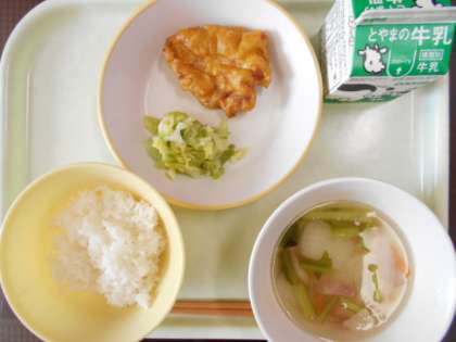 今日の献立は、ご飯、ポークパコラ、ゆでキャベツ、かぶのスープ、牛乳です。