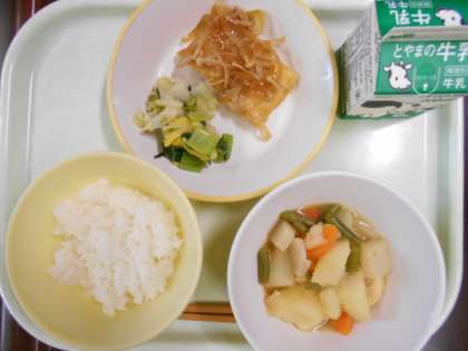 今日の献立は、ご飯、魚の黒酢あん、はくさいひたし、関東だき、牛乳 です。