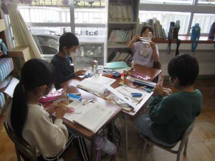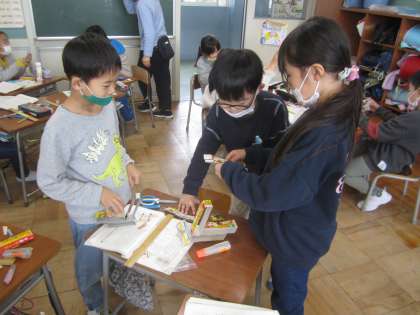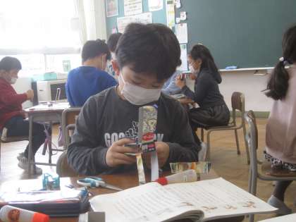 今日は、教科書の説明を見ながら、馬のおもちゃ作りに取り組みました。班でよく教科書の本文を読んで、声を掛け合いながら、協力して作っている姿が見られました。分からない部分は、写真を見ることによって、詳しく分かることに気付いたようです。