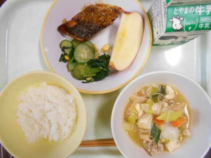 今日の献立は、ご飯、あじのみりん焼き、コーン和え、豚肉と野菜の甘辛煮、りんご、牛乳 です。