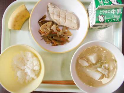 今日の献立は、ご飯、鰆の塩焼き、茎わかめのきんぴら、具たくさん汁、バナナ、牛乳です。