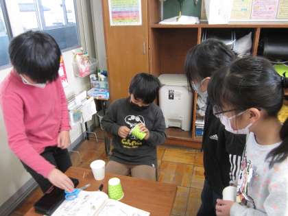 それぞれが自分の作りたいおもちゃを作っています。ゴムの数を増やしたり、重さを変えたりと、一人一人の工夫が見られます。