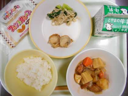 今日の献立は、ご飯、ほたての香味焼き、はりはり和え、酢豚、牛乳 です。8月から11月生まれの子供たちには「バースデーデザート」がつきました。