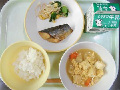 ご飯、鰆の西京焼き、コーン和え、厚揚げの卵とじ、牛乳 です。