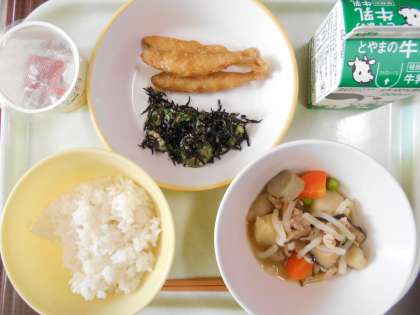 今日の給食の献立は、ご飯、わかさぎのフリッター、ひじきのごま和え、豚肉の南蛮煮、納豆、牛乳 です。