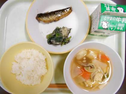 今日の献立は、ご飯、いわしの梅煮、よごし、すいとん、牛乳 です。