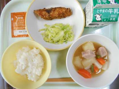 今日の献立は、ご飯、魚のえごまだれ、ゆでキャベツ、大根と豚肉の煮込み、穀物ふりかけ、牛乳 です。