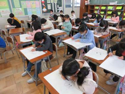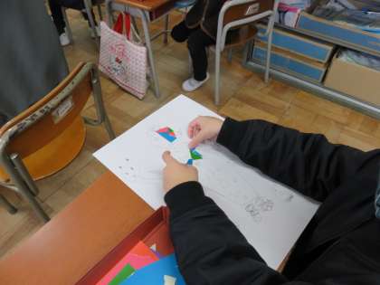 図画工作科の学習では、子供たちが想像した「おしゃれなモンスター」を版画で表現します。大きな紙に下絵を描いたら、インクがついた紙を貼って版を作っていきます。おしゃれにしようと飾りを付けたりカラフルにしたり、子供たちは、思い思いにモンスターを描いていました。