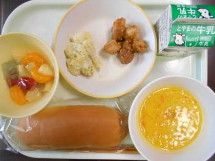今日は、学校給食週間3日目。献立になった本は「シンデレラ」です。献立は、コッペパン、豚肉のハニーマスタードソースがけ、グリーンポテト、シンデレラポタージュ、ガラスのカクテル、牛乳 です。ポタージュは、「かぼちゃ」の馬車にちなんで「かぼちゃ」が入り、フルーツカクテルには、「ガラスの靴」をイメージした2種類のゼリーが入っています。目で見ておいしい、食べて満足の華やかな献立でした。(写真は給食室前にある献立と本の紹介コーナーです)