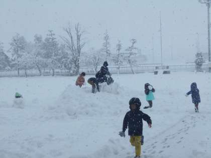 たくさんのふわふわの雪が積もったグラウンドには、早速「雪遊び」をする子供たちの姿がありました。氷点下の寒さもなんのその。元気いっぱいの新保っ子です。