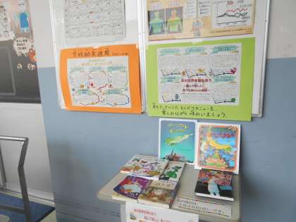 今日は、学校給食週間3日目。献立になった本は「シンデレラ」です。献立は、コッペパン、豚肉のハニーマスタードソースがけ、グリーンポテト、シンデレラポタージュ、ガラスのカクテル、牛乳 です。ポタージュは、「かぼちゃ」の馬車にちなんで「かぼちゃ」が入り、フルーツカクテルには、「ガラスの靴」をイメージした2種類のゼリーが入っています。目で見ておいしい、食べて満足の華やかな献立でした。(写真は給食室前にある献立と本の紹介コーナーです)
