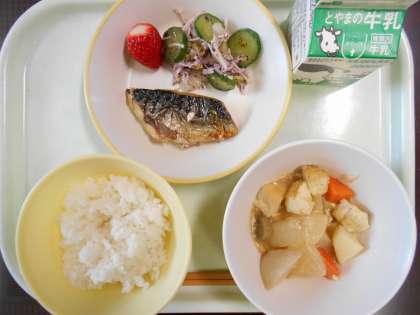 今日の献立は、本「男子弁当部」にちなんだ献立で、ご飯、さばの塩焼き、えのきの梅肉和え、のっぺい、いちご、牛乳 です。