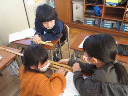 1学期に長さを学習した子供たち。今日は、昔の人が手や腕を使って長さを表していたことを知り、自分の腕の長さを測ってみました。30cmの竹ものさしを使って測ると、「長さが足りない!」「もっと長いものさしがほしいな、160cmくらいの!」「長い長さを表す単位がほしい」というリクエストが。1メートルの竹ものさしを渡すと、楽々測ることができました。