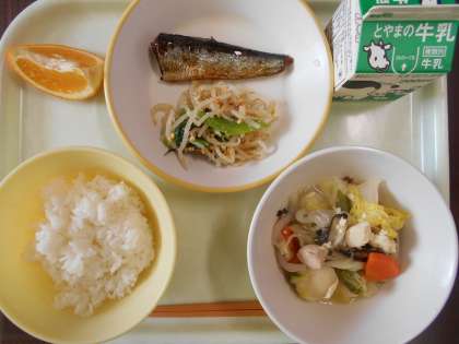 今日の献立は、ご飯、ちゃんこ鍋、イワシのピリ辛煮、いり大豆和え、いよかん、牛乳 です。