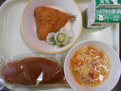 今日の献立は、黒糖コッペパン、あじフライ、かぶのサラダ、マカロニスープ、牛乳 です。