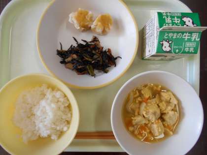 今日の献立は、ご飯、にんじんシューマイ、ひじきと小松菜の炒め煮、高野豆腐の卵とじ、牛乳 です。