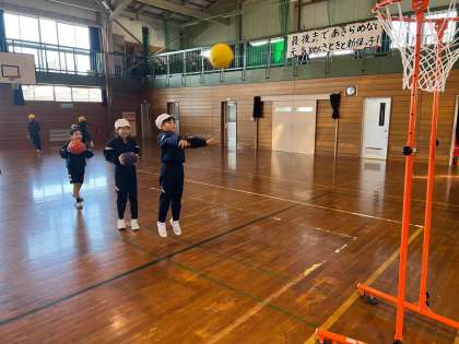まずは、ゴールにボールを投げ入れる練習からです。みんなで楽しみながら行っています。