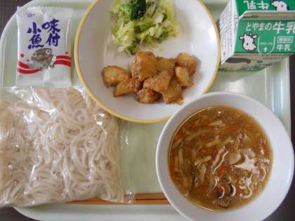今日の献立は、ソフト麺の五目あん、ごまだれポテト、キャベツとブロッコリーのドレッシング和え、味付け小魚、牛乳 です。