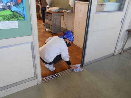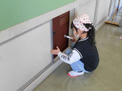 今日も「ピッカピカーン作戦」実行中。子供たちは重点掃除箇所を確認し、一生懸命に環境を整えていました。