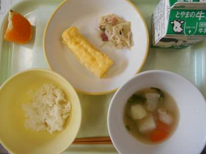 今日の献立は、ご飯、卵ロール、はりはりソテー、野菜のスープ煮、甘平(みかん)、牛乳 です。