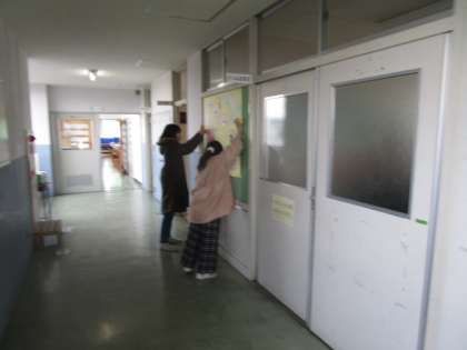 いよいよ、卒業お祝い週間が目前に迫ってきました。どのグループも最後の準備に取りかかりました。写真は、先生方の協力を得て、飾りを掲示している飾りグループの様子です。