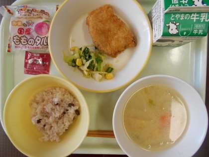 今日の献立は、6年生の卒業をお祝いした「卒業お祝い献立」で、赤飯、とんかつ、コーン和え、紅白白玉汁、桃のタルト、ごま塩、牛乳です。(写真では見えませんが、ピンクと白の白玉が入った特別仕様の白玉汁です)