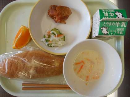 今日の献立は、揚げパン、鶏肉のトマトソース味、大根サラダ、米粉シチュー、デコポン、牛乳 です。