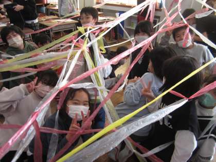 5時間目、図書室から戻ってくると、3年2組の教室で楽しそうな図画工作科をしていました。ちょっと教室にお邪魔させてもらい、「ひもひもワールド」で遊んできました。