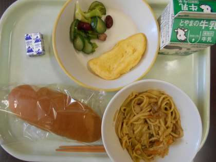 今日の献立は、コッペパン(減量)、焼きそば、オムレツ、ビーンズサラダ、ポケットチーズ、牛乳 です。