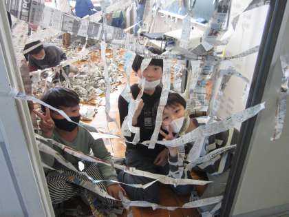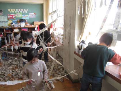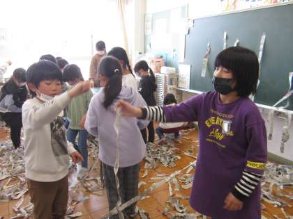 今日は、1組と2組でグループを作り、細く切った新聞紙の感触を楽しみながらの図工の時間となりました。教室中に新聞紙をつないだり、つるしたりする中で、「ここ持って!」「ここテープで貼って!」と声を掛け合いながら、ダイナミックな作品を作ることができました。