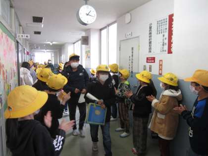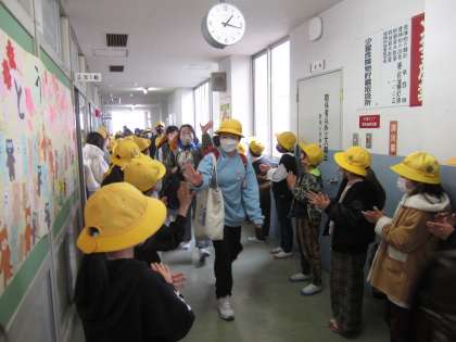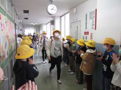 明日の卒業式に参加することはできませんが、今日の下校前に6年生さんのお見送りをしました。登校班やたてわり班で一緒だった6年生さんに手を振ってもらい、嬉しそうな子供たちでした。