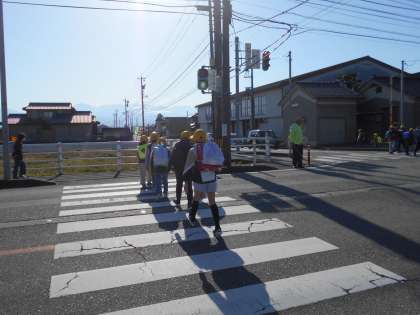 今日は、1〜6年生が揃っての初登校の日。集団登校の班長を先頭に、安全に気を付けて子供たちが登校してきました。