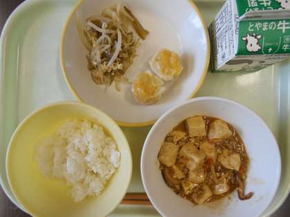 今日の献立は、ご飯、にんじんシューマイ、茎わかめのチョナムル、マーボー豆腐、牛乳 です。