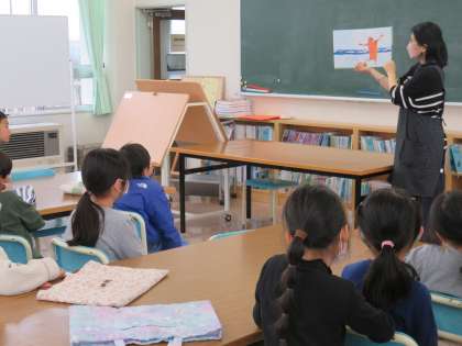 楽しみにしていた図書館オリエンテーション。司書の先生の読み聞かせでは、お話の世界に引き込まれていました。