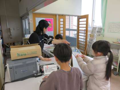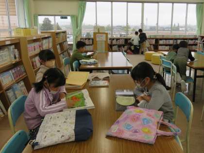 子供たちは、読みたい本を選んで貸出をしてもらい、早速、読みふけっていました。