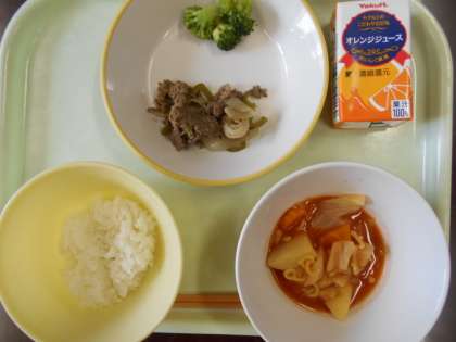 いつもは牛乳ですが、今日はジュースがつきました。トマト煮の中には「ABCマカロニ」が入っていました。いつもとは違った洋風の特別メニューを楽しみながらいただきました。