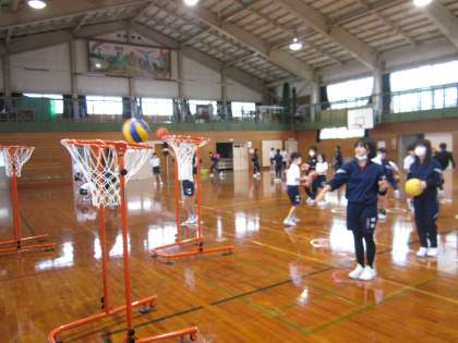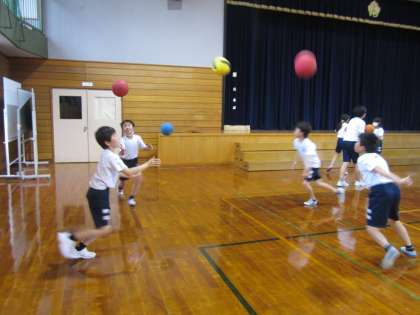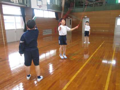 今日は、縄跳びやボールで使った運動をしました。「貯筋」をしつつ、仲間と声を掛け合い、安全に運動しています。