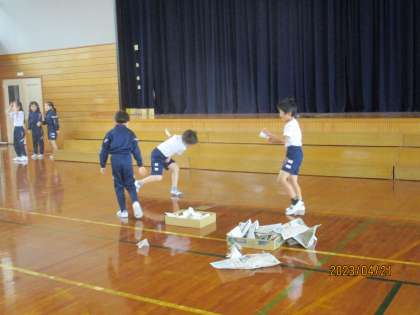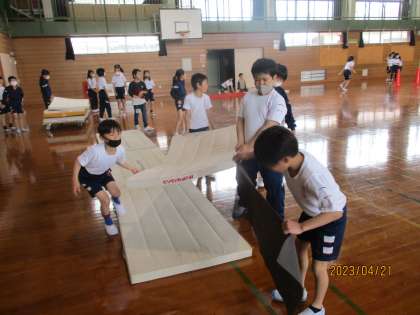 今日の体育では、体ほくしや体力つくりのため、6つのコーナーをつくってサーキットトレーニングをしました。みんな休む間もなく、一生懸命取り組みました。準備や片付けも自分たちで協力して行いました。