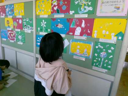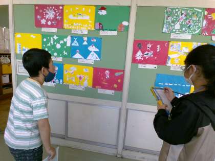 図工の作品をみんなで鑑賞しました。道具の使い方、画用紙の切り方、貼り方などたくさんの工夫を見つけました。美術館のように静かに友達のよさを感じていました。